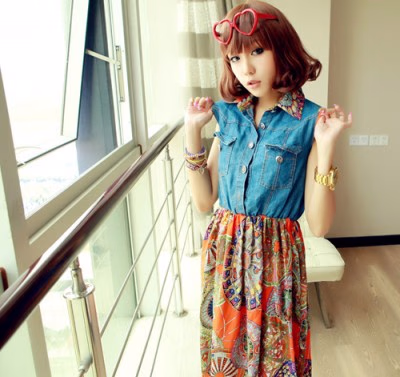 牛仔上衣搭配缤纷五彩的雪纺半身裙,抓住这个夏末的尾巴,让我们尽情凉爽吧!翻领的设计让裙子看上气质不少。摆一个可爱的姿势,七夕的主角就是你哦