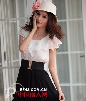 这款拼接设计的休闲黑白连衣裙,胸口和袖口的雪纺荷叶边,在休闲中更显得女人味十足。上身洁白无瑕,凸显高贵气质,黑色的下裙则代表神秘和性感,黑与白的经典撞色搭配,层次感非常分明。宽阔的束腰设计是关键,不仅仅在于收腰和修饰效果,更在于其营造出了一种“出淤泥而不染”的意境,犹如一朵高洁的莲花,傲然绽放。