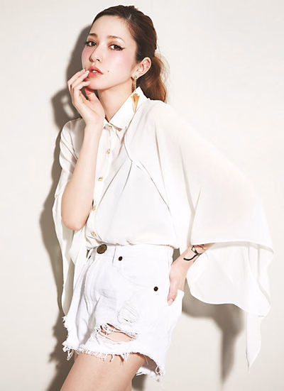 蝙蝠袖衬衫在白色的衬托下显得无比高雅秀气,把衬衫塞进裤腰里更有利落感。大大的蝙蝠袖能遮掩所有上身的不足,宽松的版型让人像迎着夏风开始舒展起来,再和同色系的白色破洞牛仔裤搭配,散发着清新自然的优雅和舒适。