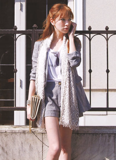 彰显OL职场气质的套装,利落的西装短裤和休闲白T恤相当率性干练,印花围巾尽显高街范儿。