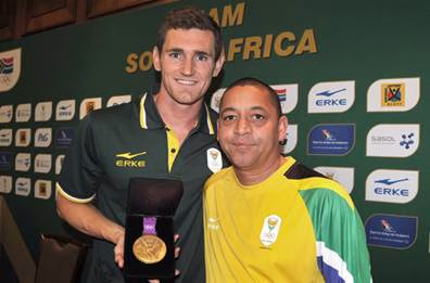 100米蛙泳冠军范德博格(左)与南非代表团成员合影,身着鸿星尔克品牌