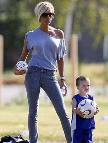 贝嫂穿的这款一字领T恤虽然造型简单但却非常时尚妩媚,搭配牛仔裤帅气大方。即使是与孩子们外出玩耍时贝嫂依然不改潮人本色,连站姿都保持着模特的造型,精神可嘉。