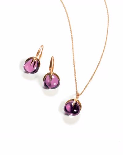 浪漫是爱情的永恒主题,浪漫也是两人关系中一种无尽的牵系,浪漫像一剂毒药散发着致命的诱惑。Pomellato(宝曼兰朵)Veleno系列(取 义自意大利语的“毒药”)中以紫晶作为主打宝石的全套珠宝蕴含着浓浓的爱意。神秘而浪漫的紫晶寓意着“爱情”,也被称作“爱情的守护石”。该系列珠宝的造 型设计以圆润的水滴或豌豆造型呈现,也像一颗颗充满神秘力量的紫色药丸,做爱情的良药,为爱人见证恒久远的信条。
