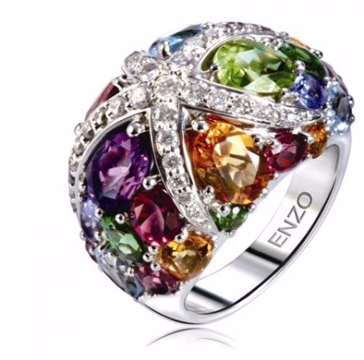 ENZO海洋系列中各种明亮的彩色宝石,也分别有着不同含义,令海洋系列多了一份玄妙及深切的祝福。例如,红碧玺象征爱情、石榴石象征幸福、黄水晶象征财富、绿碧玺象征成功、海蓝宝象征青春、黄玉象征自信、紫水晶象征智慧等。把这些珍贵的宝石巧妙地放在一起,组成了如大海一样丰富迷人的珠宝首饰,包括耳环、戒指以及吊坠,适合配衬简约的休闲服以及高贵的晚装。