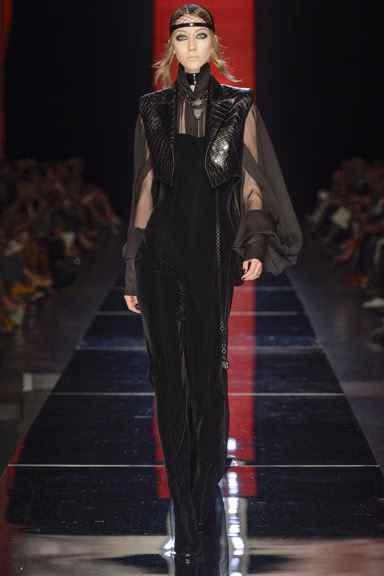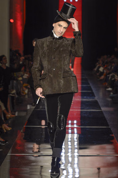 Gaultier的设计涵盖了两部分,一部分是他与生俱来的洒脱,而另一部分则是对巴黎的一次郑重的问候,并且他将这两部分巧妙的穿插在了一起。英国老牌超模Erin O'Connor为本此高定秀开场。她头戴着高耸的礼帽,身着燕尾服,配以绅士的怀表链。而接下来出场的模特,将Gaultier对于吸烟装轮廓无比的沉醉展现的淋漓尽致。包括一件与Dior的Bar Suit极为相似的外套。在Galliano的丑闻曝出之后,Gaultier是接班人的最热门人选之一。在这一季,Dior以Raf Simons的亮相又一次站在了聚光灯下,将我们带回了那段令人揪心的日子。