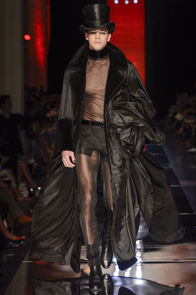 当地时间,7月4日,巴黎。Jean Paul Gaultier 2012秋冬高级定制发布。连体裤似乎是这场的主角,黑色中的薄纱与皮革相拼接令T台上女模的中性光辉盖过男模(当然,妖男们则是另一种魅力)。网状头饰让你想起了什么?“功夫足球”里的赵薇?