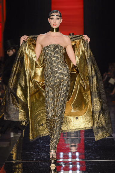 不过Gaultier在开场之后,便不慌不乱的用事实来证明唯有自己才能驾驭的颓废,浪漫,并且多变的设计风格。那件开场时的燕尾服一而再再而三的出现在了秀场上,材质上运用到了鳄鱼皮,颜色上则运用到了驼色。在男装方面,Gaultier将一种奸诈的服装表情植入了他的针线之中。而最后的那件新娘礼服,外套的下摆分片搭在了硕大的白色半裙上,而在外套的后片则延伸成为天鹅羽翼的形状。同样的,设计师还将和服的轮廓引入到了晚装的设计之中,以创造出一种世纪交替的情感。颜色的选取上,如苦艾酒一般碧绿色,以及珊瑚色,金色,还有紫罗兰色,仿佛梦境一般。Gaultier将纯艺术的概念在设计中延伸,其中包括了一些从球状关节机械获得的灵感。他们也许是来自于电影《大都会》中的机器人,或者出自小说家Georges Méliès的作品《雨果》,Gautier的设计总是像写给巴黎的一首情歌一般美丽动人。