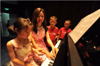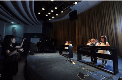 (图二)公益钢琴音乐会现场,ChenChen老师指导I Do基金艺术关注项目邀请的打工子弟学校的孩子们熟悉钢琴演奏。