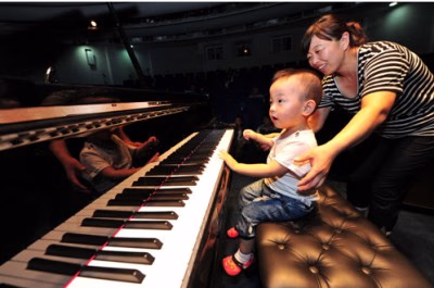 (图四)音乐会间隙,一个活泼好动的小朋友走上舞台,在妈妈的帮助下第一次触摸到黑白琴键。