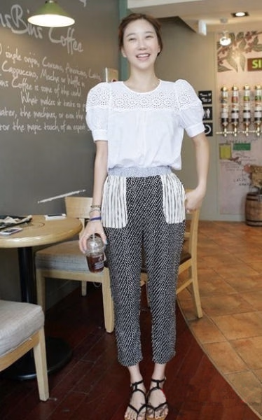精致可爱的镂空元素公主袖的上衣把小女生的可爱展现无遗,配上一条设计感极强的长裤,显出女强人的干练气质,个性的图案拼接让这条裤子看起来充满艺术气息配上简单的娃娃袖上衣,显出精致优雅感觉,独显那份清雅姿态。