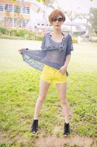 如果衣服过于单调、有点小暴露搭配一件镂空针织罩衫再好不过了,灰常凉爽又显气质!镂空罩衫配上亮眼的荧光绿,显出少女的活泼和动感滋味,很是甜美阳光。