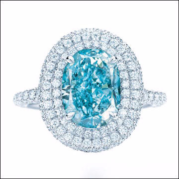 “蒂芙尼周年纪念蓝”(Tiffany Anniversary Blue)艳彩绿蓝色钻石,重达2.51克拉,铂金戒托上包围镶嵌璀璨白钻。
