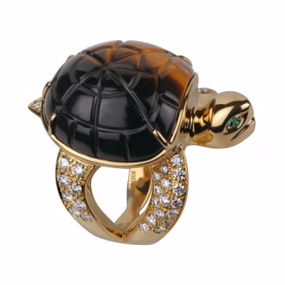 TORTUE 乌龟系列以18K玫瑰金生动地塑造出乌龟流畅的身躯和微微昂首的姿态,头部仿佛微笑般上扬的嘴角线条,搭配祖母绿镶嵌双眼,自然活泼的神情格外讨人喜爱。BOUCHERON自2006年推出TORTUE粉水晶乌龟戒,精选粉红水晶主石,细腻流畅的雕凿出外壳圆润的弧度和放射状纹路,粉嫩的色调为动物系列添一份俏皮的春意!时隔六年,2012年BOUCHERON重新诠释品牌经典TOUTUE乌龟系列,精巧工艺雕凿虎眼石作为乌龟外壳,虎眼石沉稳神秘的色调有别于粉水晶的春意盎然,展现TORTUE乌龟系列充满成熟智慧的气质,搭配玫瑰金打造的小巧尾巴与镶满钻石的四肢,精致外型为TORTUE虎眼石乌龟戒指增添一抹柔和,将BOUCHERON工匠的巧思发挥得淋漓尽致。