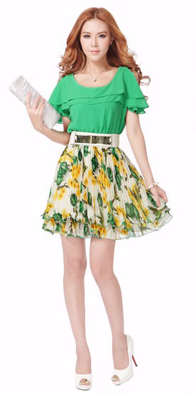 如果你希望你的肩部显得柔美一些,这款的肩部设计就是一大福音,它的袖子与领口处采用了两层荷叶边做成,既显层次感也有披风的大气效果,加上肩头的局部裸露设计彰显恰到好处的妩媚与性感。下摆更采用了今年T台流行款的花色,明媚中凸显淑女感。