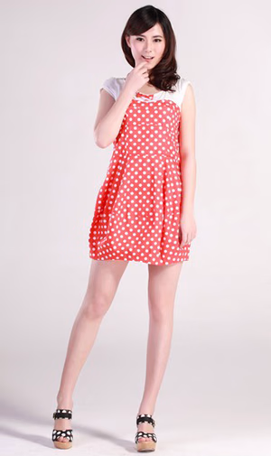 纯白与红底白圆点面料的拼接甜美可爱,散发俏皮气息,领口那只蝴蝶结更带来了立体感与生趣。前胸拼接处的设计贴合女性胸部曲线,巧妙打造丰满效果。而下摆花苞式的设计则将可爱与优雅完美结合,帮助你立减3-5岁。