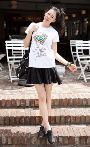 彩虹般灿烂的微笑总能激励逆境中的人继续前行,胸前印着彩虹心形,层层的正能量光芒赐予人无限希望。不规则小黑裙与之搭配,满是青春气息。黑色单肩背包与黑色皮鞋与短裙颜色相呼应,整体装着突出亮点,时尚怡人。