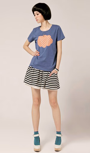 原创版本的T恤最不易出现撞衫的尴尬,舒心的蓝色简约T中心,大大的摆着几何印花图案,类似于云朵形状的大图形饱含着颗颗分明的正三角形,充满现代摩登感的复古配色应用其中,吸睛度100%。条纹短裙应接其下,加之条纹短袜一同配合,将简约又极具个性的几何搭配演绎到极致。