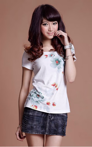 相当普通的白色T恤,之上的风景水墨画描绘出池塘盛夏美景,这一袭似将整个夏日的清凉都穿上了身。甄选牛仔短语与之搭配,于传统风情中插入现代动感元素,一边娴静淑雅着,一边时尚性感着。