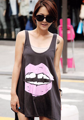 嘴唇图案印图T 恤个性抢眼,吸引足了眼球。宽松随意的底摆,不规则的设计增加造型感。遮掩赘肉效果很赞哦。可以内搭吊带或者抹胸,时尚度满分。