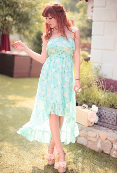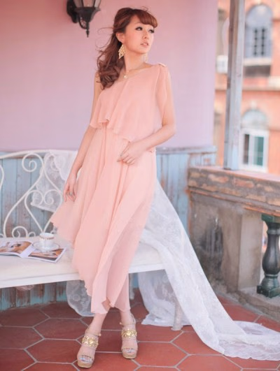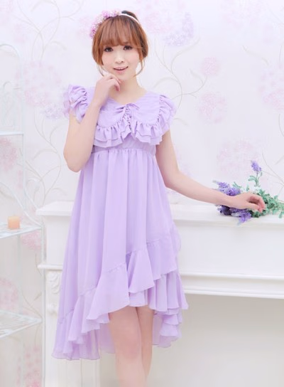 不规则荷叶边连衣裙,好像一只翩然起舞的蝶,浪漫的荷叶边在胸前层叠,带来了极美的视觉效果;由于是雪纺,不规则的裙摆更具飘逸味道。
