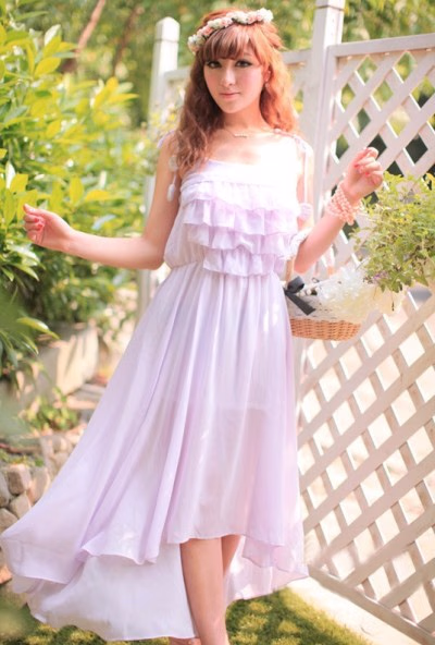 不规则雪纺连衣裙,冰激凌紫色不规则裙,肩部是有带钻的小爱心的系带,很漂亮的哦。