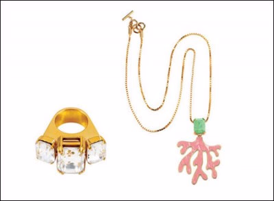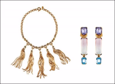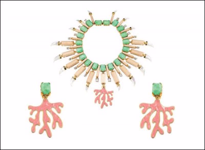 新系列由若干存在感首饰组成——耳环、领型项链、宽手镯和鸡尾酒戒指——材质包括施华洛世奇水晶、染色木材、树脂和天然半宝石,水蓝、紫罗兰、珊瑚色和绿色构成清爽的水彩色盘。价格区间450美元至3500美元。House of Lavande 2013度假系列要在11月才开始销售,但从现在开始到6月15日可在 Moda Operandi 预定。