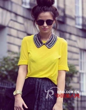 明黄色的上衣,配上假领式的项链,俏皮的样子,突显性感的小女人味。黑色的百褶裙是其显高的心机美搭。