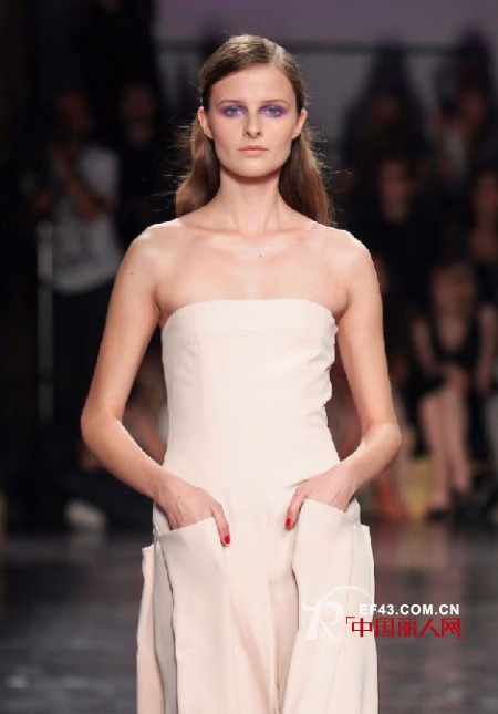 本季,颇显剔透肤色的christophe Josse也启用了口袋元素,裸色的不对称上衣与亮丽的金色兽纹裙搭配,模特抄兜的姿态自信又高贵。