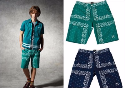 手帕印花短裤使用绿色和蓝色作为底色,在短裤四周缀以果叶勾勒出四块手帕形状,内里用白色印花作为点缀,令整体感觉十分简洁清爽。左边裤腿上的扳手图案绣花可见DICKIES在细节上的诚意,一扫普通短裤的沉闷感。