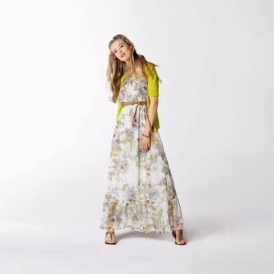 充满了飘忽不定精灵气质的超长裙,搭配爽朗的休闲上装,轻松的装束正式这个春天的时尚符号。而蕾丝长裙是所有女孩的梦中情人,在肩头搭配开衫,或者加顶小帽,休闲的打扮与蕾丝裙最搭配,中和大面积蕾丝过于甜美的感觉。Anyway,如果你想打造不一样的长裙效果,大面积的分散花朵和休闲开衫的搭配可以帮你,分散的大面积花朵时时散发出优雅气质,而开衫的休闲性,巧妙的散发出随性,让你的造型瞬间捉摸不定,让人着迷。