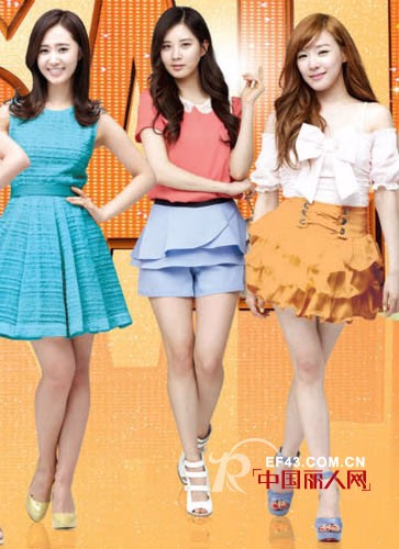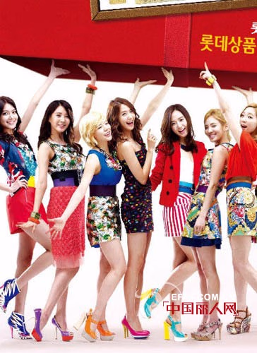 亮片、印花、糖果色、萤光色、拼色等2012夏装流行元素都集于一身的宣传照,印花和亮片在缤纷色调的衬托下,散发出的气场强大得无人能及,而少女时代成员们也完美地展现了今夏流行的高腰裙装、背心连衣裙的时尚魅力。