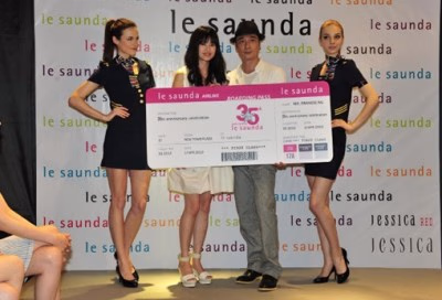 执行董事及行政总裁Ms. Alice Lau向吴镇宇送赠le saunda 35周年纪念航班登机证