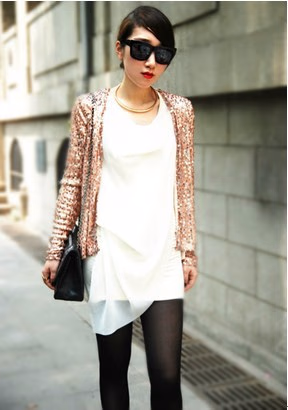 我们也在翻东西网站为大家寻找了一些搭配风格,如炫金色亮片开衫内搭白色简约连衣裙,彰显个性的潮流态度,墨镜及配饰也为整身搭配画龙点睛,成功打造欧美大牌范儿!