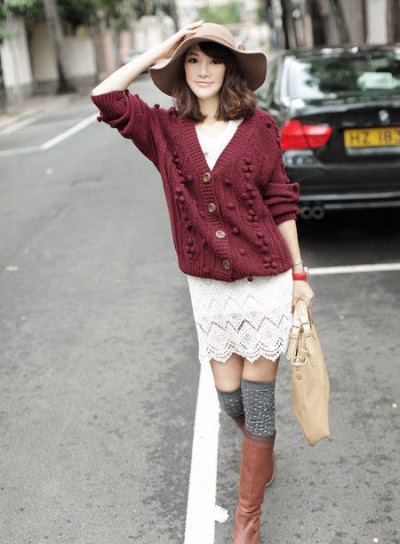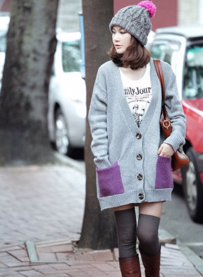 淡灰色的毛衣外套,宽松的长款线条,没有拘束感,显露出非常时尚的慵懒味道,衣兜采用了精美的贴兜设计,个性十足,深V字型的衣领,给人以非常浪漫而时尚的性感气息。