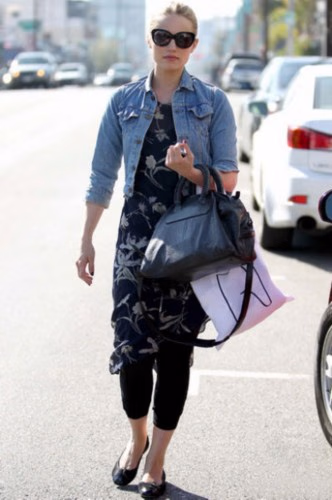 《欢乐合唱团》中的大美女Dianna Agron,牛仔外套搭配印花连衣裙,混搭了条7分打底裤。