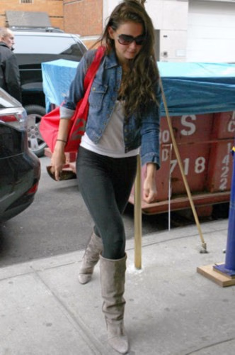 阿汤嫂Katie Holmes,继续着她一贯的西部大婶风,牛仔外套搭配白背心、打底裤、高筒靴。