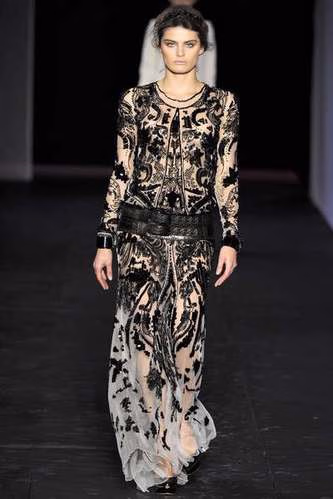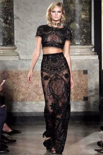 蕾丝从辅助的点缀变成主要面料被用到Roberto Cavalli的最新设计中,曳地雪纺长裙加入蕾丝拼接,让视觉上有了绝妙的体验。