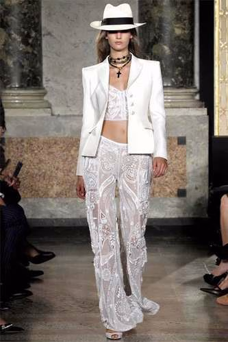 蕾丝最早出现在美国,曾受到贵族们的追捧。蕾丝在2012春夏的形态不再是简单的装饰点缀。Emilio Pucci让蕾丝的温柔化成了潇洒。白色蕾丝的安然恬静在长裤的设计中,变得大气利落。再搭配上简洁线条的西装外套和礼帽,意大利绅士的复古优雅,也不乏硬朗。