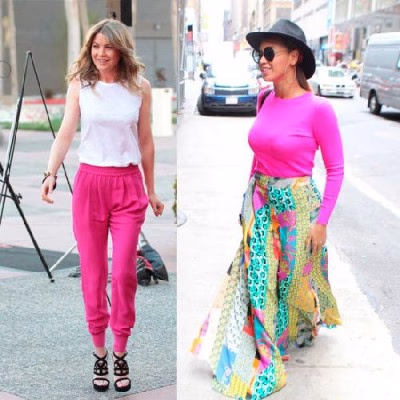 明星示范粉色混搭如果你觉得从头到脚都是粉色,让人觉得自己有装嫩的嫌疑,那选择一件粉色的同可以穿出自己的公主气质。EllenPompeo的高腰收脚长裤搭配一件无袖的白色上衣,让人觉得她是一位爱运动的小公主;Beyonce的这身搭配非常大胆,Etro的几何印花图案拼接曳地长裙搭配一件MichaelKors粉红色的开司米针织上衣,还有复古的墨镜和礼帽进行点缀。