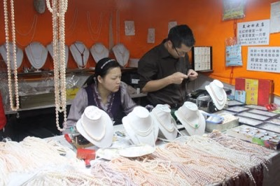 在五棵松大集上珍珠柜台十分抢眼,参展的珍珠产品就来自太湖原产地养殖场,采用现场选购珍珠,现场打眼穿线为您量身制作,让您看见实物,明明白白购买,货真价低,还有珍珠粉、珍珠面膜、珍珠胶囊,厂家当场教您如何识别真假珍珠,如何保养珍珠,如何佩戴珍珠。