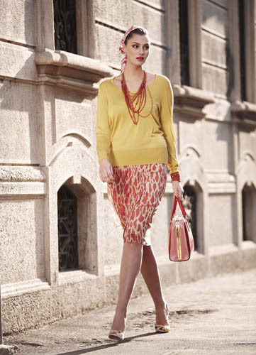 黄色基本款大领口针织衫搭配粉橙色豹纹乔其纱短裙,整体配饰颜色锁定在珊瑚粉色,明亮温暖的色调令人愉快。