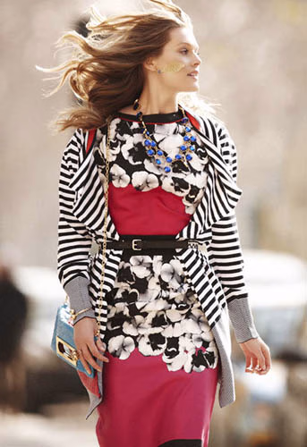 很多微胖女郎都会刻意避开横条纹上衣,然而在纯色底上的印花短裙与之搭配,有收紧视觉的作用。