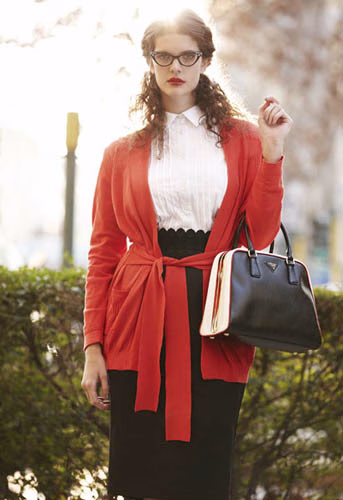 英国女教师的装扮以经典的黑白红配色完成,高腰的半截裙与长款针织衫能制造视觉落差营造层次。Prada Pyramide手袋是本季街拍红牌。