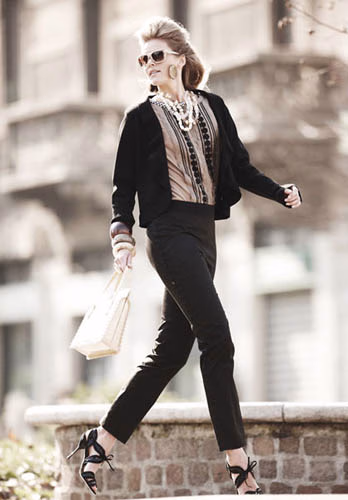 黑色针织衫搭配半截裙最容易流于平庸,用金色薄底衫搭配,和彩色蛇纹手拿包Highlight,一定有亮点。