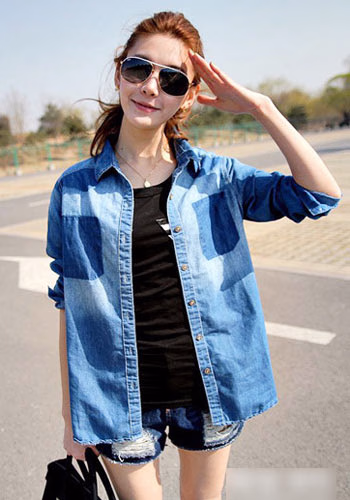 牛仔衬衣是近段时间火热的单品,这款韩版牛仔衬衫,采用了加深底色的假口袋设计,做旧的渐变水洗,配上金色的对冲色纽扣,街头范儿十足,让你立刻吸引街拍爱好者的眼球,没准明天,你就出现在各大时尚杂志哦。
