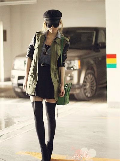 时尚解析:军装复古风,用的都是时下流行的百搭款式,牛仔衬衫搭配高腰裙的搭配,酷劲十足,搭配她们最爱的“囧”包,一向走甜美路线的姐妹俩,这么打扮起来也是时尚的酷女郎。