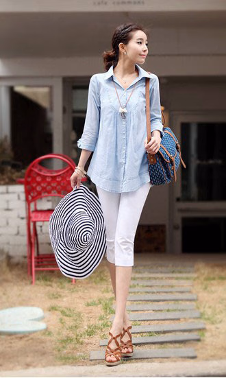 02 精织棉材质透气柔软,天蓝色系显气质清新优雅,前襟U型剪裁富有典雅宫廷范,与之形成的微褶皱有效遮掩腹部肉肉。弧形的下摆也非常美观大气,加上微卷荷叶边的袖口使整体知性与休闲感并具。