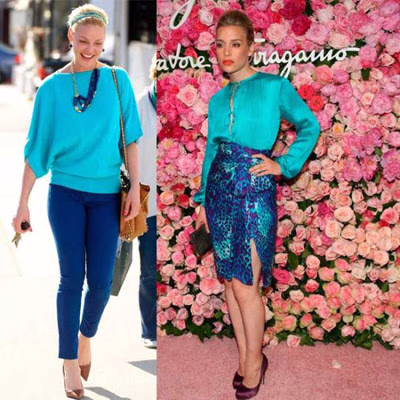 Piper Perabo 和 Katherine Heigl 把不同色调的蓝色单品搭配在一起,从视觉上产生一种渐变的效果。 Katherine Heigl 选择一件湖蓝色的宽松针织上衣搭配一条深蓝色的紧身牛仔裤,然后用深蓝色的项链进行呼应,虽然是出门上街也看得出是经过精心打扮一番; Piper Perabo 出席活动时选择2012 春夏 Salvatore Ferragamo 的一条蓝色豹纹短裙搭配一件湖蓝色衬衣,在张弛之间拿捏的非常到位。