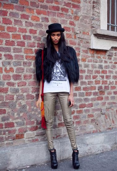 前卫的金属色瘦腿裤搭配人像T恤和帅气皮草,个性的感觉立刻涌现,女孩的酷帅面格外吸引人。