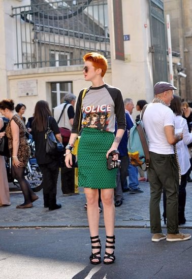 帅气的人像T恤搭配复古风格的职业筒裙,风格相撞别有一番味道。